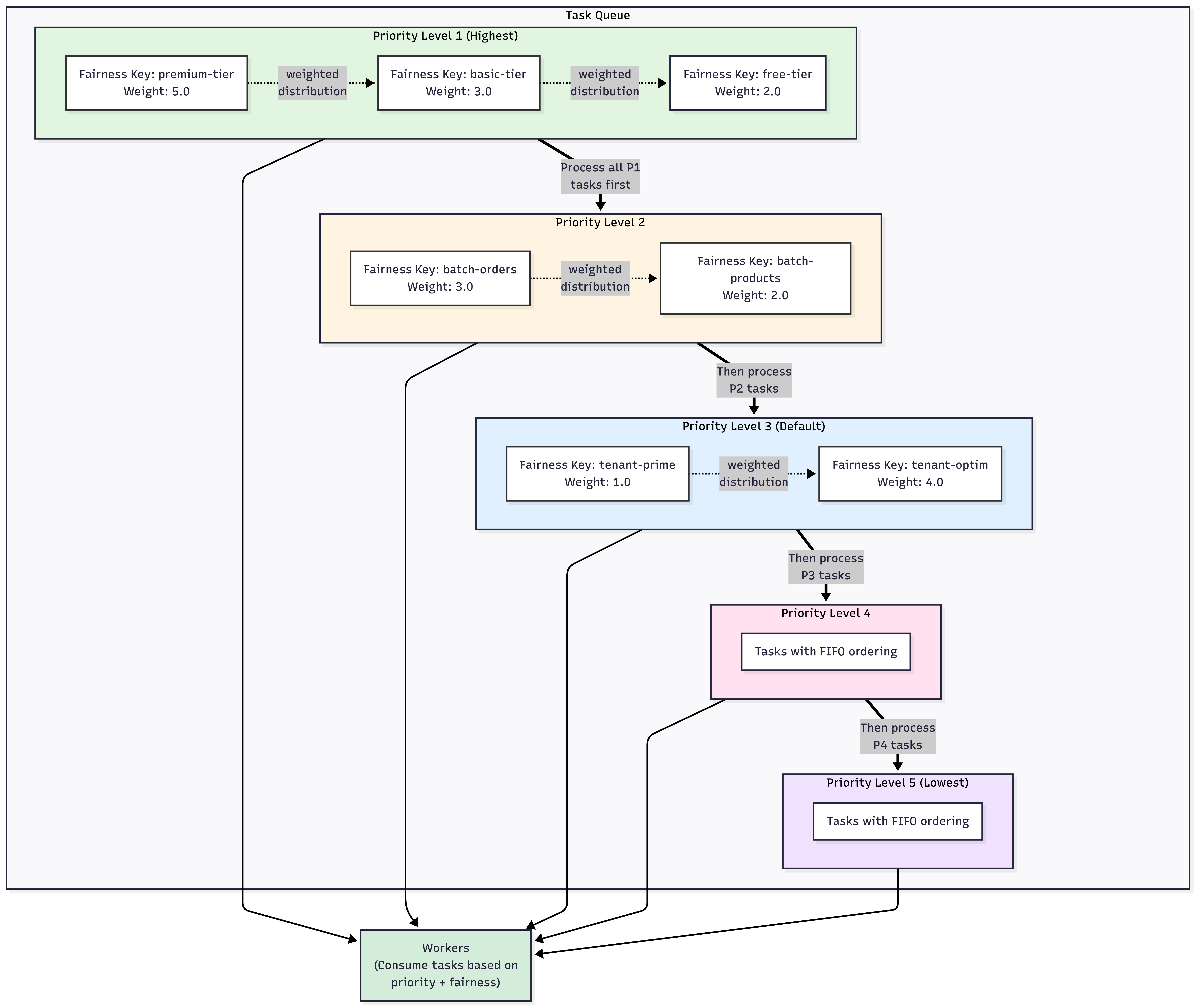 Task Queue Fairness lets you distribute Tasks based on fairness keys and their fairness weight within a Task Queue. The fairness keys are used to describe your Task structure. A fairness key can correspond to different tier levels, tenants, or other groupings useful to your workloads.
